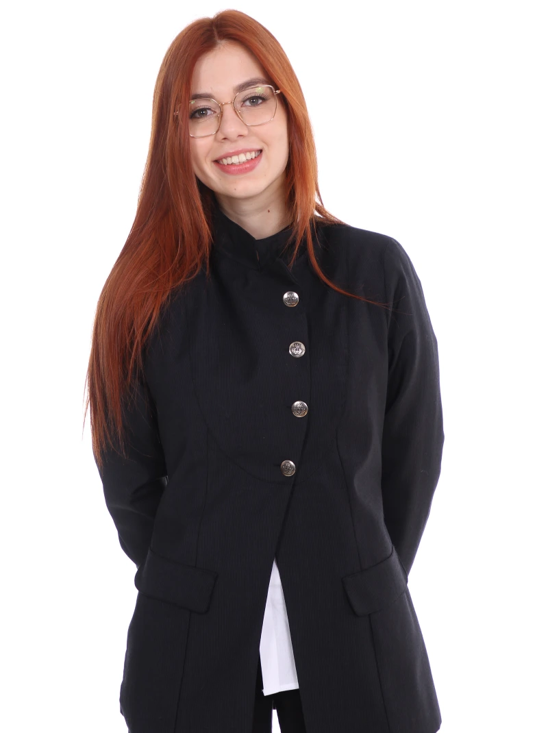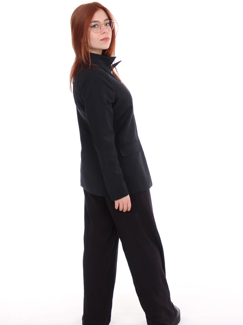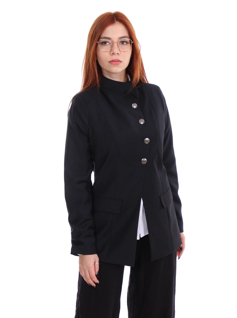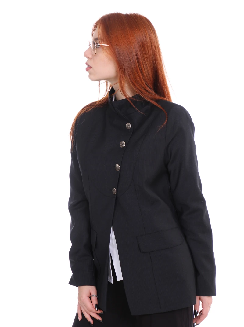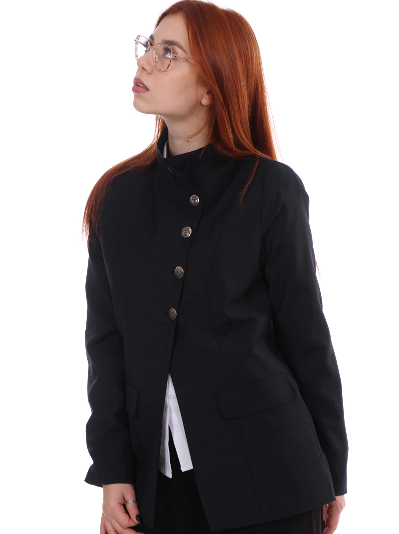 Taior din stofa subtire usor elastica, cu o croiala eleganta in clini, maneci lungi, partile din fata ies in evidenta cu o croiala rotunda ampla,se inchide in nasturi mari metalici, iar gulerul are o taietura asemanatoare reverului ridicat.